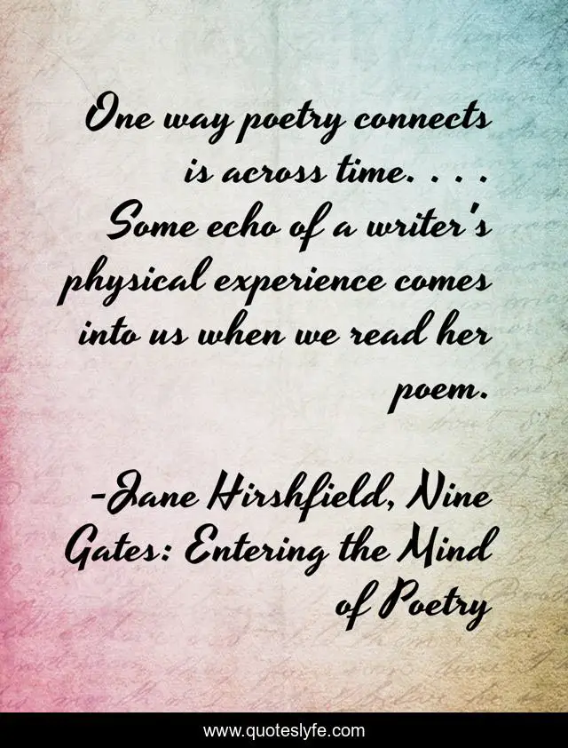 This page presents the quote "One way poetry connects is across time. . . . Some echo of a writer's physical experience comes into us when we read her poem.". Author of this quote is Jane Hirshfield, Nine Gates: Entering the Mind of Poetry. This quote is about connections, poetry, experience, time,.