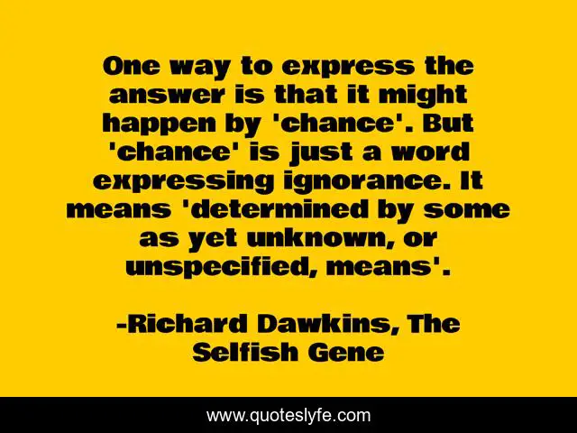 This page presents the quote "One way to express the answer is that it might happen by 'chance'. But 'chance' is just a word expressing ignorance. It means 'determined by some as yet unknown, or unspecified, means'.". Author of this quote is Richard Dawkins, The Selfish Gene. .