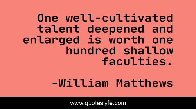 This page presents the quote "One well-cultivated talent deepened and enlarged is worth one hundred shallow faculties.". Author of this quote is William Matthews. .