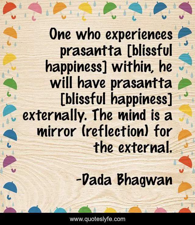 This page presents the quote "One who experiences prasantta [blissful happiness] within, he will have prasantta [blissful happiness] externally. The mind is a mirror (reflection) for the external.". Author of this quote is Dada Bhagwan. This quote is about mirroe, spiritual, external, happiness,.