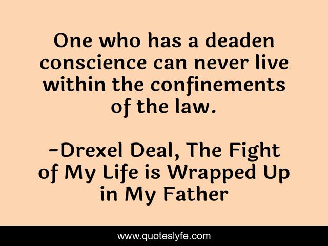 This page presents the quote "One who has a deaden conscience can never live within the confinements of the law.". Author of this quote is Drexel Deal, The Fight of My Life is Wrapped Up in My Father. This quote is about criminals, violence, law-abiding, good-citizens, law-breakers, cold-hearted,.