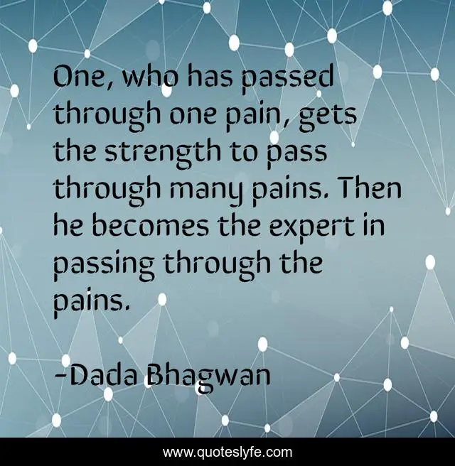 This page presents the quote "One, who has passed through one pain, gets the strength to pass through many pains. Then he becomes the expert in passing through the pains.". Author of this quote is Dada Bhagwan. This quote is about spiritual, pain, strength-to-pass-through-pain, expert,.