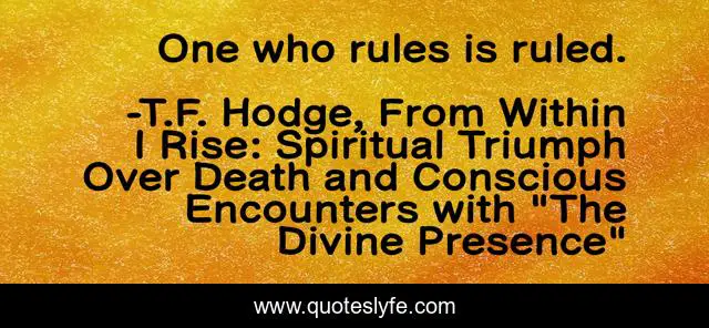 This page presents the quote "One who rules is ruled.". Author of this quote is T.F. Hodge, From Within I Rise: Spiritual Triumph Over Death and Conscious Encounters with "The Divine Presence". .