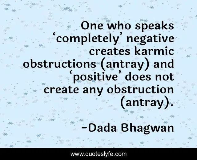 This page presents the quote "One who speaks ‘completely’ negative creates karmic obstructions (antray) and ‘positive’ does not create any obstruction (antray).". Author of this quote is Dada Bhagwan. This quote is about spiritual, positive, positivity, confidence, negative, obstruction, karma, karmic-obstructions, negativity,.