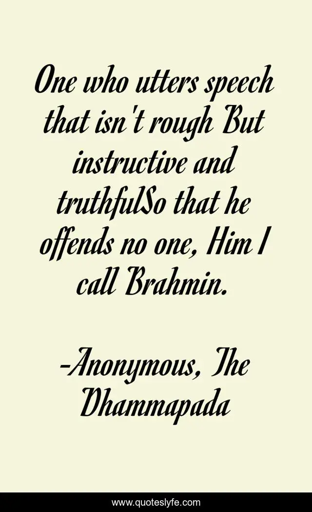 This page presents the quote "One who utters speech that isn't rough But instructive and truthfulSo that he offends no one, Him I call Brahmin.". Author of this quote is Anonymous, The Dhammapada. This quote is about compassion, constructive-criticism, v-408, buddhist,.
