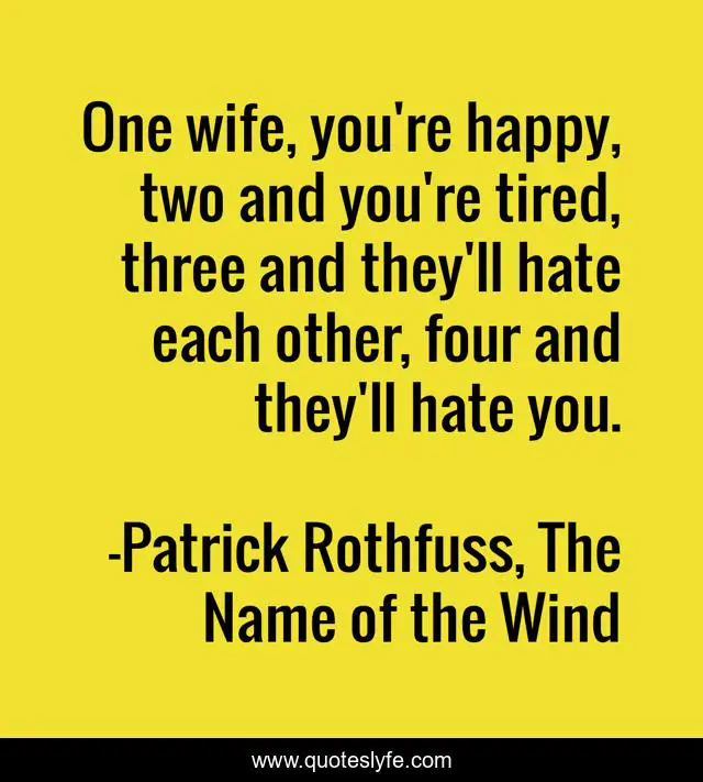 This page presents the quote "One wife, you're happy, two and you're tired, three and they'll hate each other, four and they'll hate you.". Author of this quote is Patrick Rothfuss, The Name of the Wind. This quote is about polygamy, wife,.
