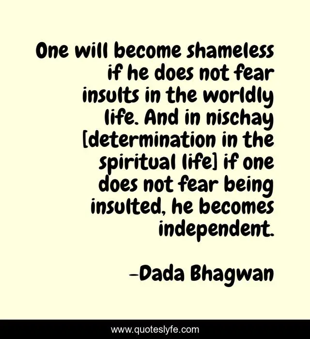 This page presents the quote "One will become shameless if he does not fear insults in the worldly life. And in nischay [determination in the spiritual life] if one does not fear being insulted, he becomes independent.". Author of this quote is Dada Bhagwan. This quote is about independent, spiritual, wordly-life, insult, spiritual-life, nischay, insults, shameless,.