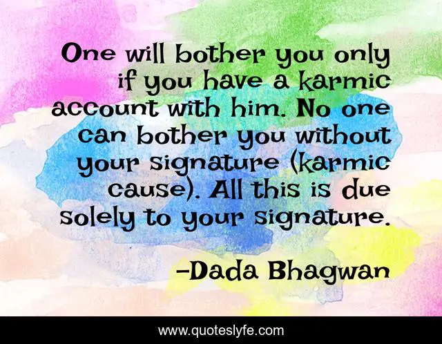 This page presents the quote "One will bother you only if you have a karmic account with him. No one can bother you without your signature (karmic cause). All this is due solely to your signature.". Author of this quote is Dada Bhagwan. This quote is about karmic-cause, karmic-effect, karma, spiritual, karmic-account,.