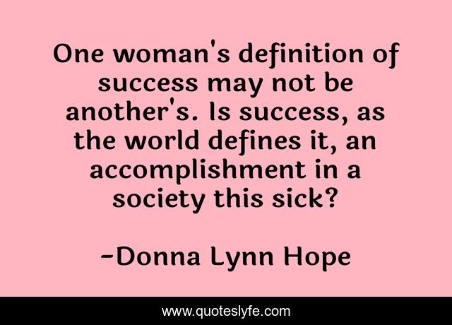 This page presents the quote "One woman's definition of success may not be another's. Is success, as the world defines it, an accomplishment in a society this sick?". Author of this quote is Donna Lynn Hope. This quote is about successful, society, success,.