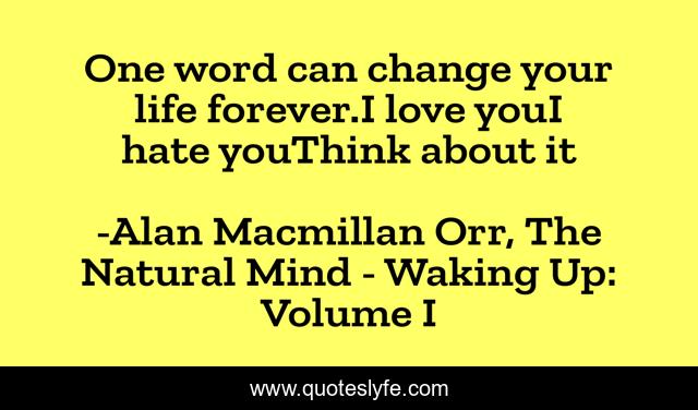 This page presents the quote "One word can change your life forever.I love youI hate youThink about it". Author of this quote is Alan Macmillan Orr, The Natural Mind - Waking Up: Volume I. This quote is about enthusiasm, philosophy, mind, humanity, inspirational,.