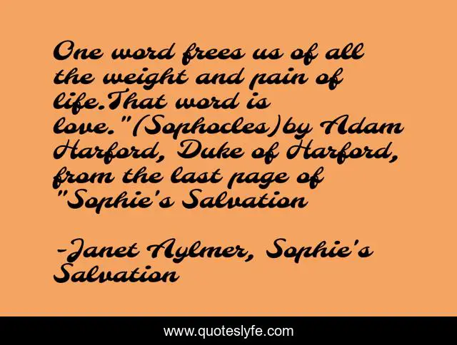 This page presents the quote "One word frees us of all the weight and pain of life.That word is love."(Sophocles)by Adam Harford, Duke of Harford, from the last page of "Sophie's Salvation". Author of this quote is Janet Aylmer, Sophie's Salvation. This quote is about regency-romance, hero, jane-austen, love-story,.