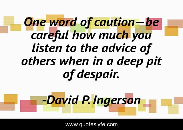 This page presents the quote "One word of caution—be careful how much you listen to the advice of others when in a deep pit of despair.". Author of this quote is David P. Ingerson. This quote is about enthusiasm, advice, despair, caution, inspirational,.