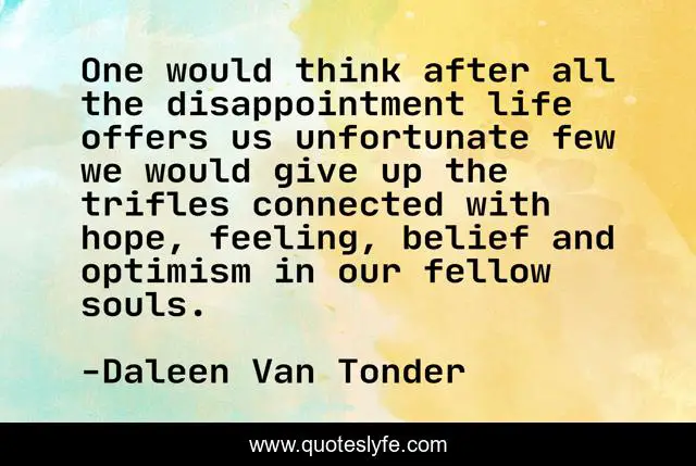 This page presents the quote "One would think after all the disappointment life offers us unfortunate few we would give up the trifles connected with hope, feeling, belief and optimism in our fellow souls.". Author of this quote is Daleen Van Tonder. This quote is about dissapointment, belief, hope,.