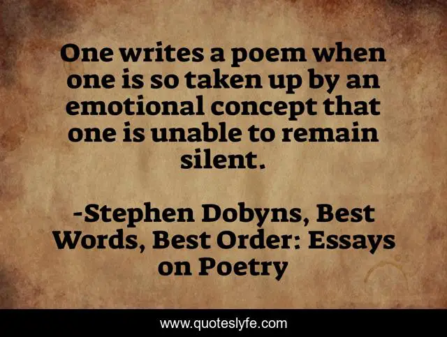 This page presents the quote "One writes a poem when one is so taken up by an emotional concept that one is unable to remain silent.". Author of this quote is Stephen Dobyns, Best Words, Best Order: Essays on Poetry. .