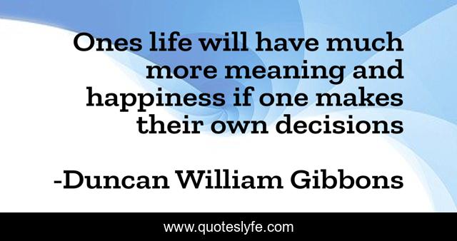 This page presents the quote "Ones life will have much more meaning and happiness if one makes their own decisions". Author of this quote is Duncan William Gibbons. This quote is about thought, living, life, meaning-of-life, happiness,.