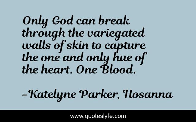 This page presents the quote "Only God can break through the variegated walls of skin to capture the one and only hue of the heart. One Blood.". Author of this quote is Katelyne Parker, Hosanna. This quote is about race-and-racism-in-america, race-relations, christian, inspirational, enthusiasm,.