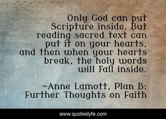 This page presents the quote "Only God can put Scripture inside. But reading sacred text can put it on your hearts, and then when your hearts break, the holy words will fall inside.". Author of this quote is Anne Lamott, Plan B: Further Thoughts on Faith. This quote is about heart, god, scripture, word, text,.
