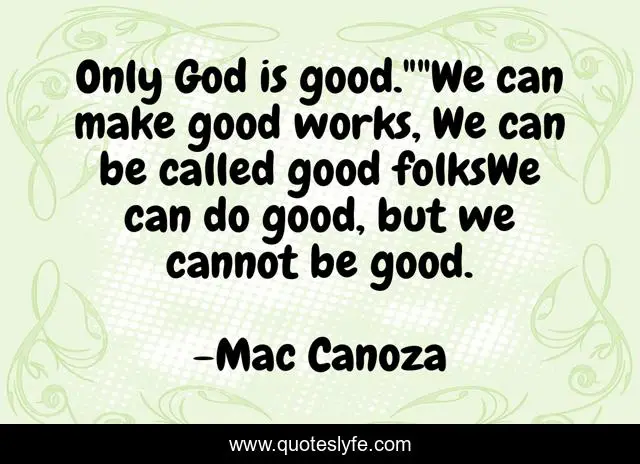 This page presents the quote "Only God is good.""We can make good works, We can be called good folksWe can do good, but we cannot be good.". Author of this quote is Mac Canoza. This quote is about god-is-good, righteousness, good, holiness, fruits-of-the-spirit, good-works, goodness,.
