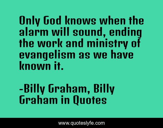 This page presents the quote "Only God knows when the alarm will sound, ending the work and ministry of evangelism as we have known it.". Author of this quote is Billy Graham, Billy Graham in Quotes. This quote is about world-evangelism, billy-graham,.