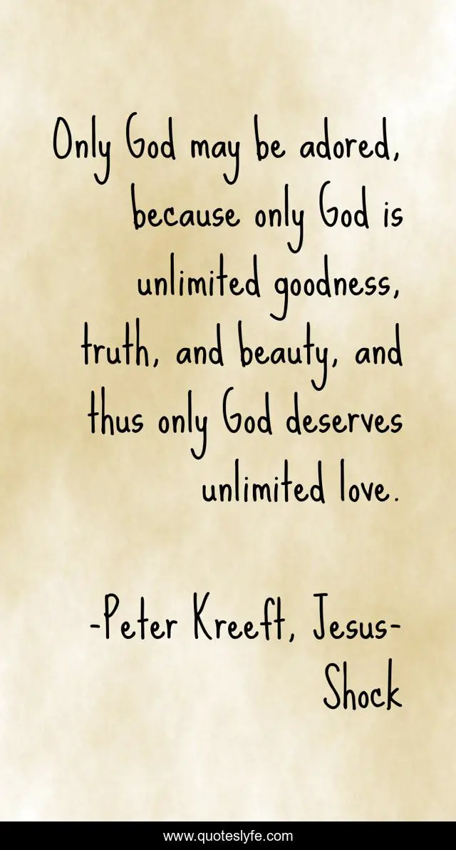 This page presents the quote "Only God may be adored, because only God is unlimited goodness, truth, and beauty, and thus only God deserves unlimited love.". Author of this quote is Peter Kreeft, Jesus-Shock. This quote is about unlimited-goodness, love, unlimited-beauty, beauty, god, philosophy, jesus-shock, truth, goodness,.