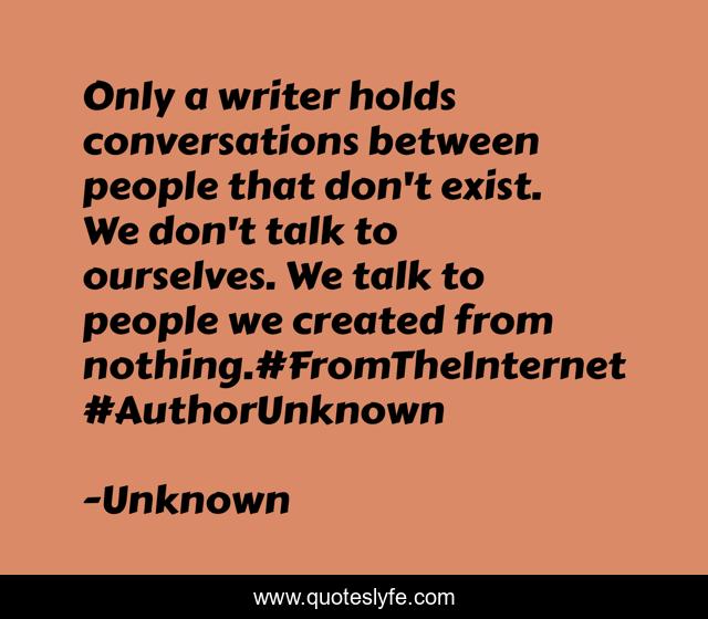 This page presents the quote "Only a writer holds conversations between people that don't exist. We don't talk to ourselves. We talk to people we created from nothing.#FromTheInternet #AuthorUnknown". Author of this quote is Unknown. This quote is about enthusiasm, writing-life, inspirational,.