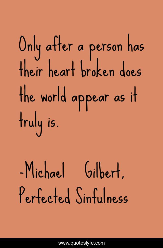 This page presents the quote "Only after a person has their heart broken does the world appear as it truly is.". Author of this quote is Michael Gilbert, Perfected Sinfulness. This quote is about heartache, love, lost-love, breakups, heartbreak, affection,.