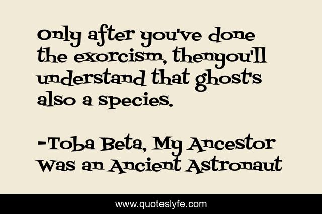 This page presents the quote "Only after you've done the exorcism, thenyou'll understand that ghost's also a species.". Author of this quote is Toba Beta, My Ancestor Was an Ancient Astronaut. This quote is about ghost, life, exorcism, secret, truth, species,.