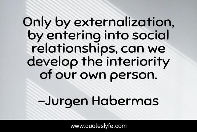 This page presents the quote "Only by externalization, by entering into social relationships, can we develop the interiority of our own person.". Author of this quote is Jurgen Habermas. This quote is about relationships, self, philosophy,.