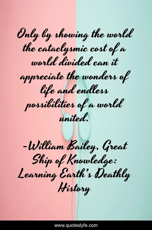 This page presents the quote "Only by showing the world the cataclysmic cost of a world divided can it appreciate the wonders of life and endless possibilities of a world united.". Author of this quote is William Bailey, Great Ship of Knowledge: Learning Earth's Deathly History. This quote is about enthusiasm, philosophy, political, inspirational,.