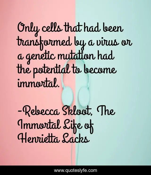 This page presents the quote "Only cells that had been transformed by a virus or a genetic mutation had the potential to become immortal.". Author of this quote is Rebecca Skloot, The Immortal Life of Henrietta Lacks. This quote is about henrietta-lacks, cancer, virus, hela, genetic-mutation, human-cells, immortal-cells,.