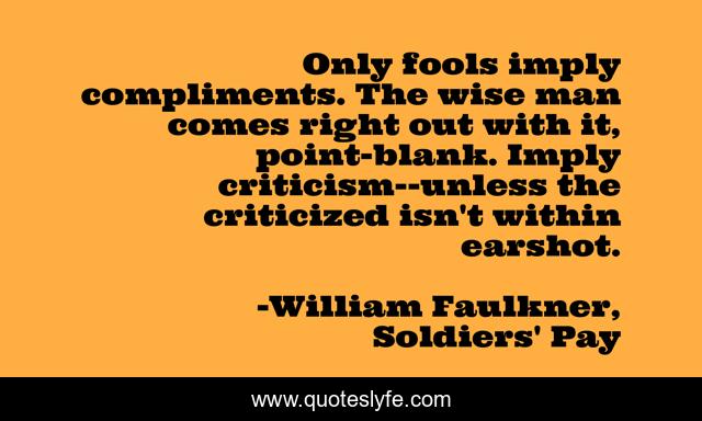 This page presents the quote "Only fools imply compliments. The wise man comes right out with it, point-blank. Imply criticism--unless the criticized isn't within earshot.". Author of this quote is William Faulkner, Soldiers' Pay. This quote is about criticism, compliments, fools, wise,.