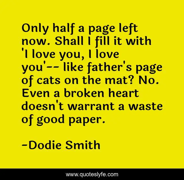 This page presents the quote "Only half a page left now. Shall I fill it with 'I love you, I love you'-- like father's page of cats on the mat? No. Even a broken heart doesn't warrant a waste of good paper.". Author of this quote is Dodie Smith. This quote is about drama, coming-of-age,.