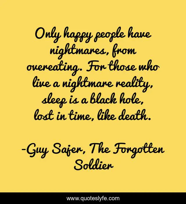This page presents the quote "Only happy people have nightmares, from overeating. For those who live a nightmare reality, sleep is a black hole, lost in time, like death.". Author of this quote is Guy Sajer, The Forgotten Soldier. This quote is about world-war-ii, death, reality, nightmares, soldier, war, dreams, happy,.