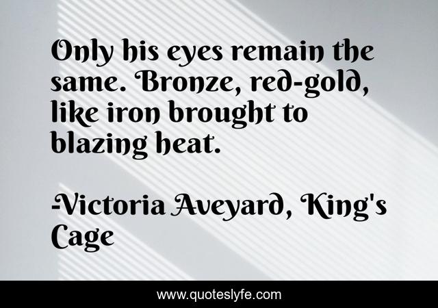 This page presents the quote "Only his eyes remain the same. Bronze, red-gold, like iron brought to blazing heat.". Author of this quote is Victoria Aveyard, King's Cage. This quote is about fire, calore, kings-cage, eyes,.