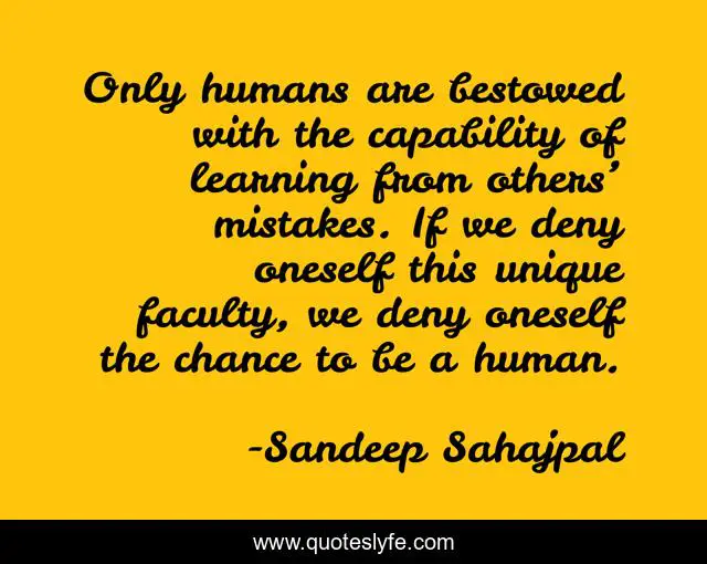 This page presents the quote "Only humans are bestowed with the capability of learning from others’ mistakes. If we deny oneself this unique faculty, we deny oneself the chance to be a human.". Author of this quote is Sandeep Sahajpal. .