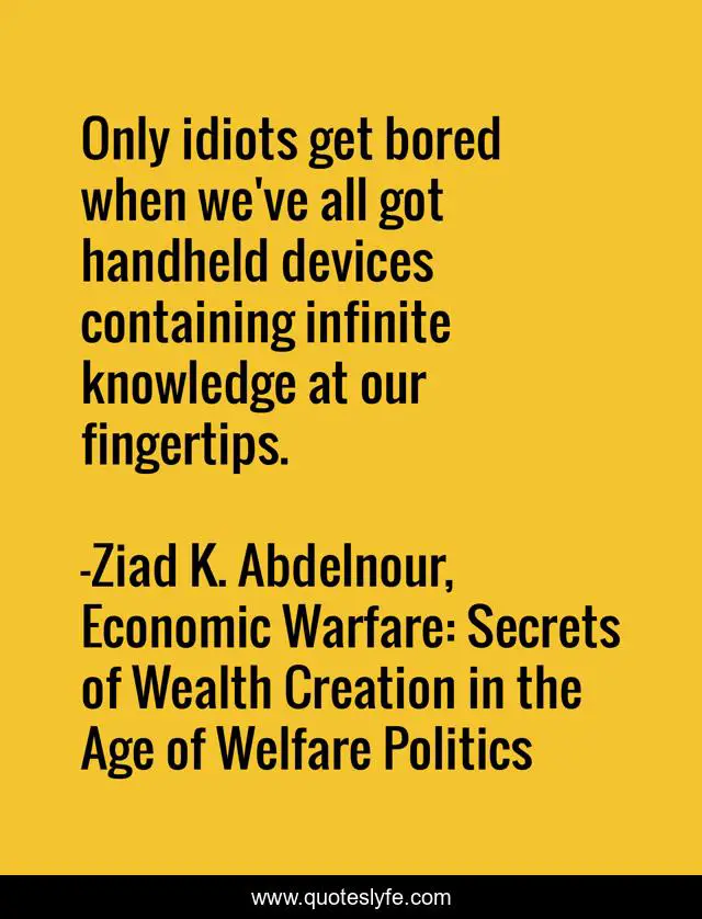 This page presents the quote "Only idiots get bored when we've all got handheld devices containing infinite knowledge at our fingertips.". Author of this quote is Ziad K. Abdelnour, Economic Warfare: Secrets of Wealth Creation in the Age of Welfare Politics. This quote is about idiots, technology,.