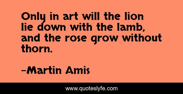 This page presents the quote "Only in art will the lion lie down with the lamb, and the rose grow without thorn.". Author of this quote is Martin Amis. This quote is about lamb, rose, lion, art, grow,.