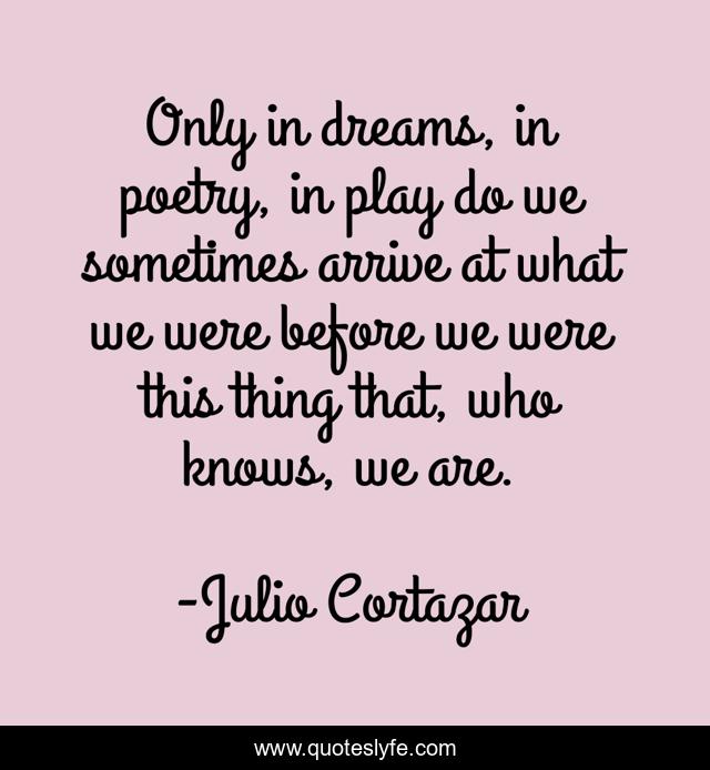 This page presents the quote "Only in dreams, in poetry, in play do we sometimes arrive at what we were before we were this thing that, who knows, we are.". Author of this quote is Julio Cortazar. This quote is about play, sometimes, poetry,.
