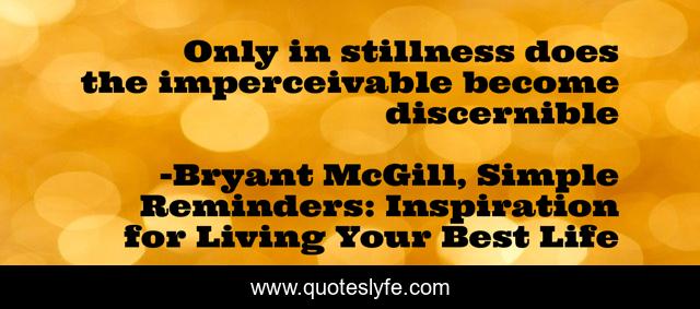 This page presents the quote "Only in stillness does the imperceivable become discernible". Author of this quote is Bryant McGill, Simple Reminders: Inspiration for Living Your Best Life. This quote is about spirituality, becoming, meditation, stillness,.