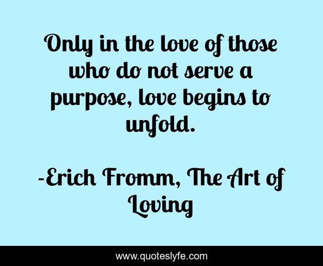 This page presents the quote "Only in the love of those who do not serve a purpose, love begins to unfold.". Author of this quote is Erich Fromm, The Art of Loving. This quote is about philosophy, psychology,.