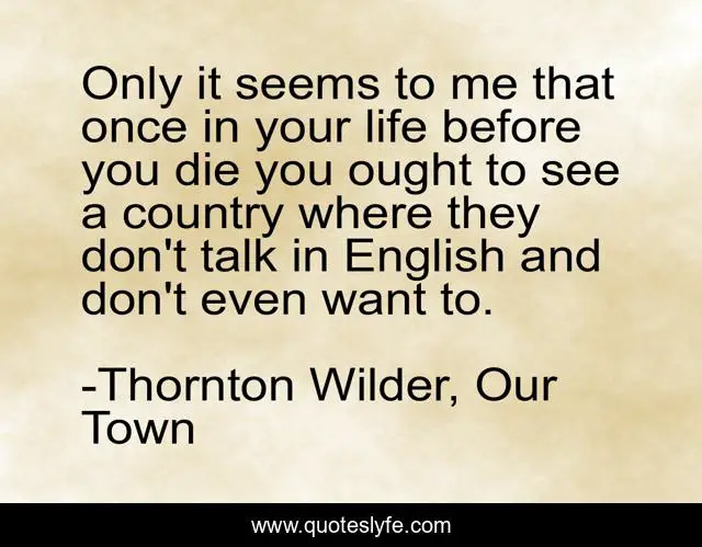 This page presents the quote "Only it seems to me that once in your life before you die you ought to see a country where they don't talk in English and don't even want to.". Author of this quote is Thornton Wilder, Our Town. .