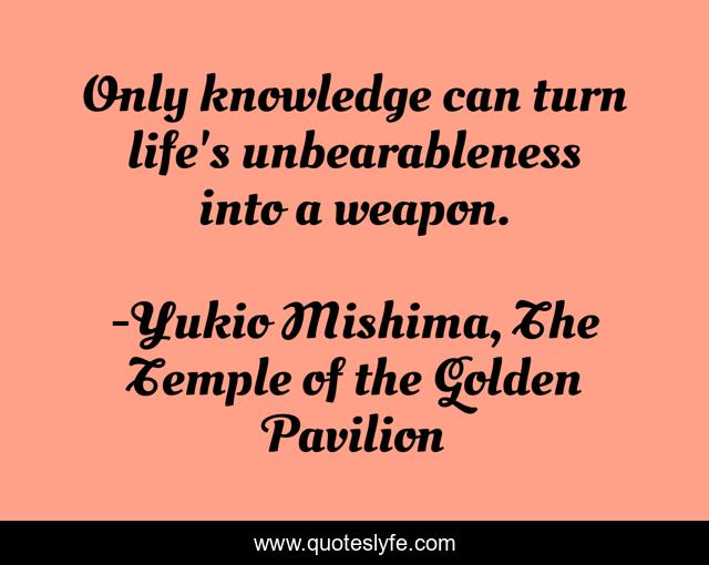 This page presents the quote "Only knowledge can turn life's unbearableness into a weapon.". Author of this quote is Yukio Mishima, The Temple of the Golden Pavilion. This quote is about existence, pain, truth,.