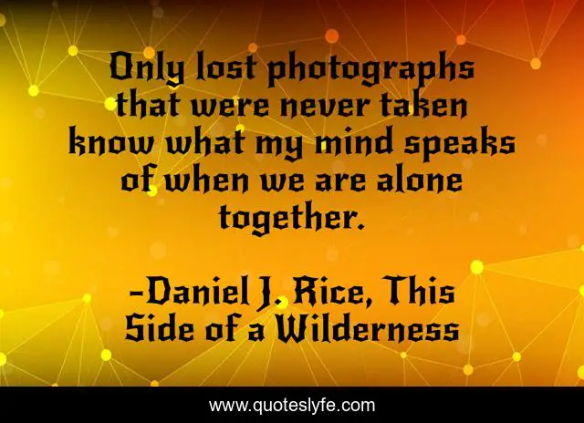This page presents the quote "Only lost photographs that were never taken know what my mind speaks of when we are alone together.". Author of this quote is Daniel J. Rice, This Side of a Wilderness. This quote is about mountains, crazy, wilderness, lost, solitude, sanity, alone, hesse,.