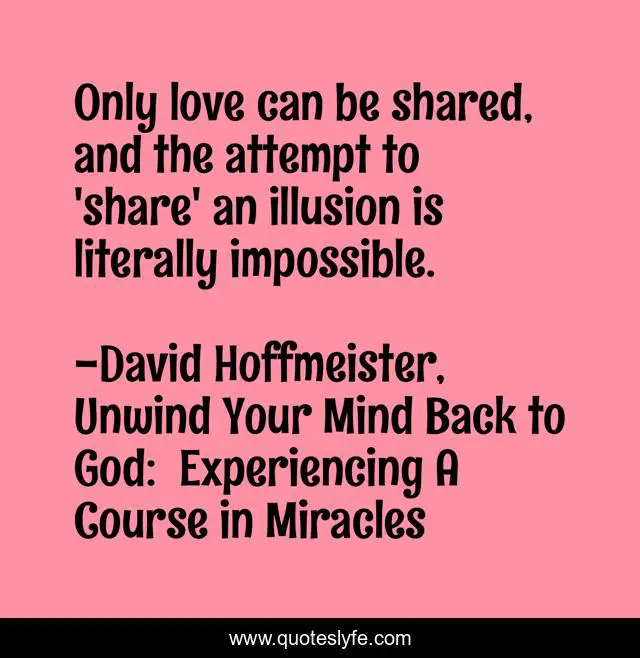 This page presents the quote "Only love can be shared, and the attempt to 'share' an illusion is literally impossible.". Author of this quote is David Hoffmeister, Unwind Your Mind Back to God: Experiencing A Course in Miracles. This quote is about back-to-god, love, unwind-your-mind, awakening, awakening-mind, david-hoffmeister, enlightenment, affection, living-miracles,.