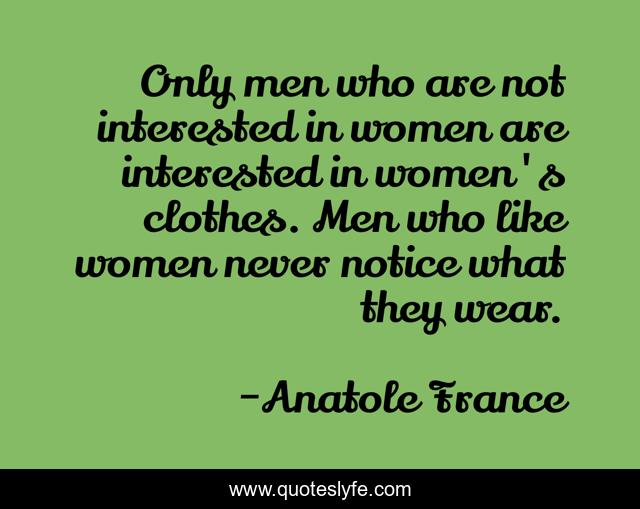This page presents the quote "Only men who are not interested in women are interested in women's clothes. Men who like women never notice what they wear.". Author of this quote is Anatole France. This quote is about men, clothes,.
