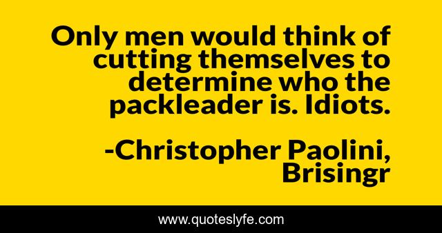This page presents the quote "Only men would think of cutting themselves to determine who the packleader is. Idiots.". Author of this quote is Christopher Paolini, Brisingr. This quote is about humans, cutting, values,.