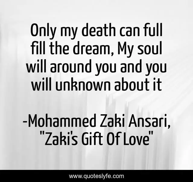 This page presents the quote "Only my death can full fill the dream, My soul will around you and you will unknown about it". Author of this quote is Mohammed Zaki Ansari, "Zaki's Gift Of Love". This quote is about world, life, love, affection,.