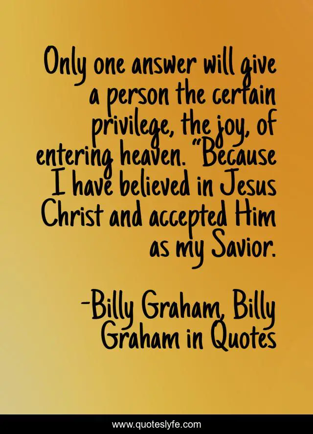 This page presents the quote "Only one answer will give a person the certain privilege, the joy, of entering heaven. “Because I have believed in Jesus Christ and accepted Him as my Savior.". Author of this quote is Billy Graham, Billy Graham in Quotes. This quote is about heaven, billy-graham,.