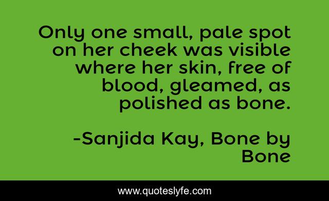 This page presents the quote "Only one small, pale spot on her cheek was visible where her skin, free of blood, gleamed, as polished as bone.". Author of this quote is Sanjida Kay, Bone by Bone. .