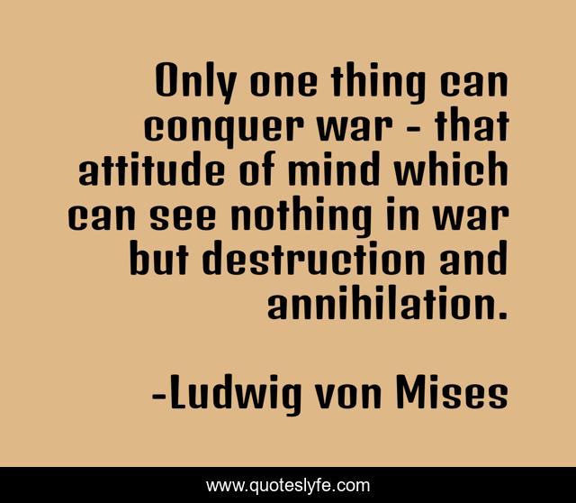 This page presents the quote "Only one thing can conquer war - that attitude of mind which can see nothing in war but destruction and annihilation.". Author of this quote is Ludwig von Mises. This quote is about mind, conquer, war,.